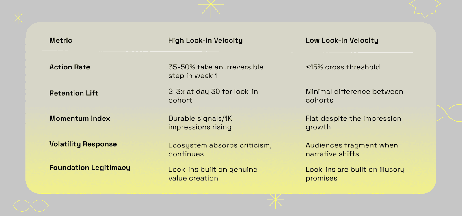 This is why Lock-In Velocity requires legitimate foundations. It's not about making exit difficult, it's about making exit costly because users would lose genuine accumulated value. The distinction matters because it separates sustainable growth from predatory design.