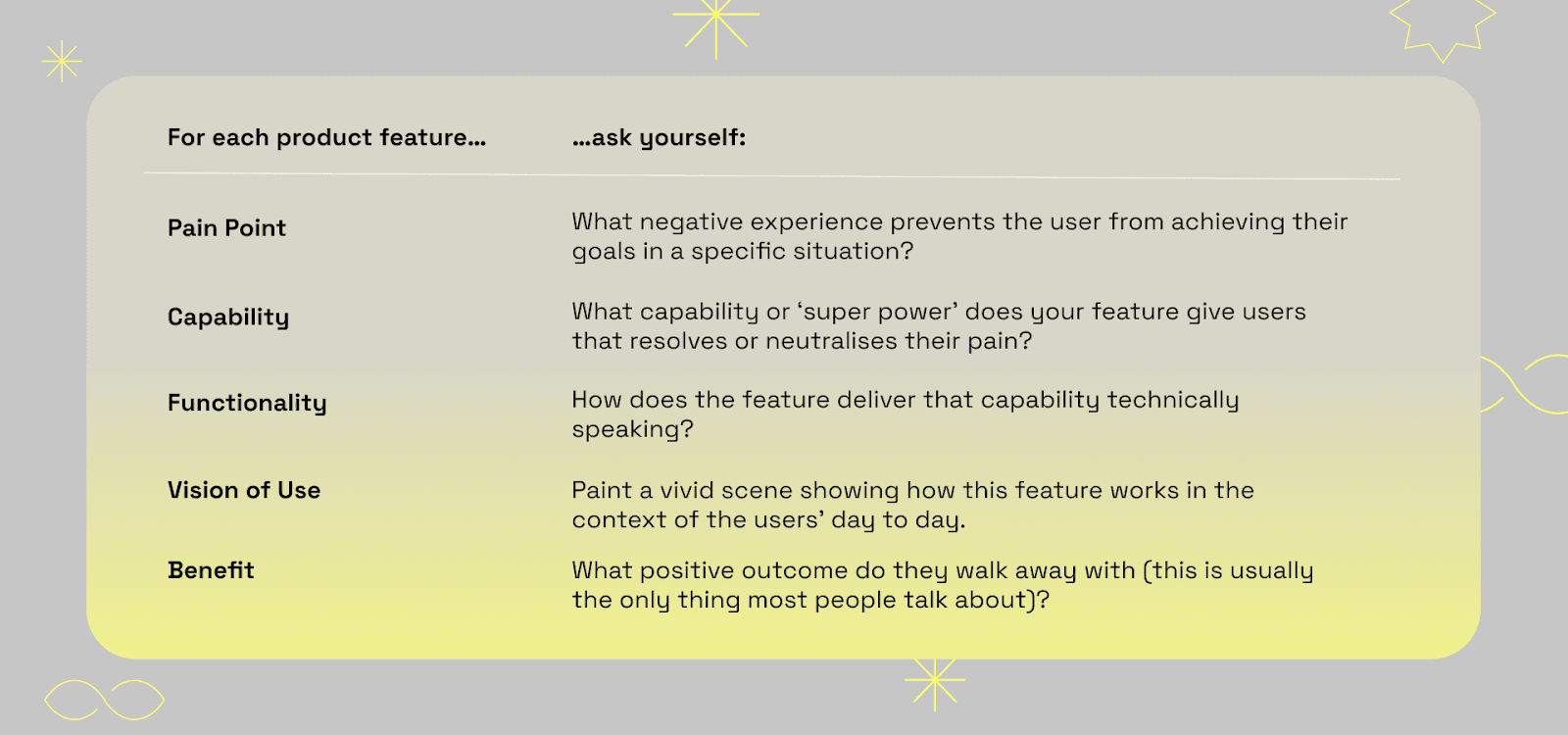 Building these matrices is really all about connecting what your product does to what your users struggle with and experience, in the context of how they could use your product or service, right now, day after day. Sometimes these are experiences users are oblivious to, because they’re mundane, or so common, they’ve become numb or apathetic towards them.