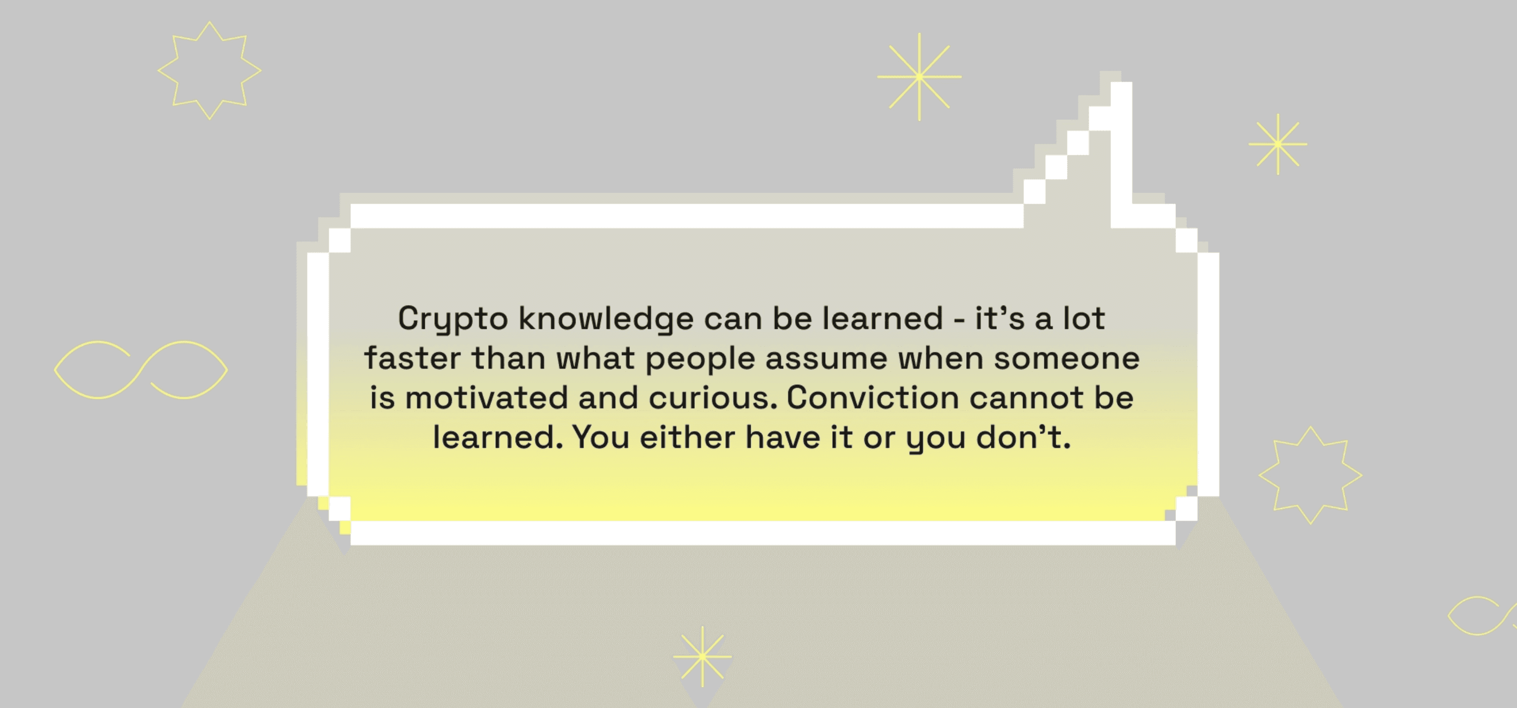 Crypto knowledge can be learned, it’s a lot faster than what people assume when someone is motivated and curious. Conviction cannot be learned. You either have it or you don’t. We forget that early-stage marketing runs entirely on conviction. The person who has spent three years in the space but never developed real narrative instincts is a much harder problem to fix than someone who understands storytelling at a cellular level and is genuinely excited about Web3 as an industry. One of those gaps closes with time and exposure. The other one doesn't really close at all.